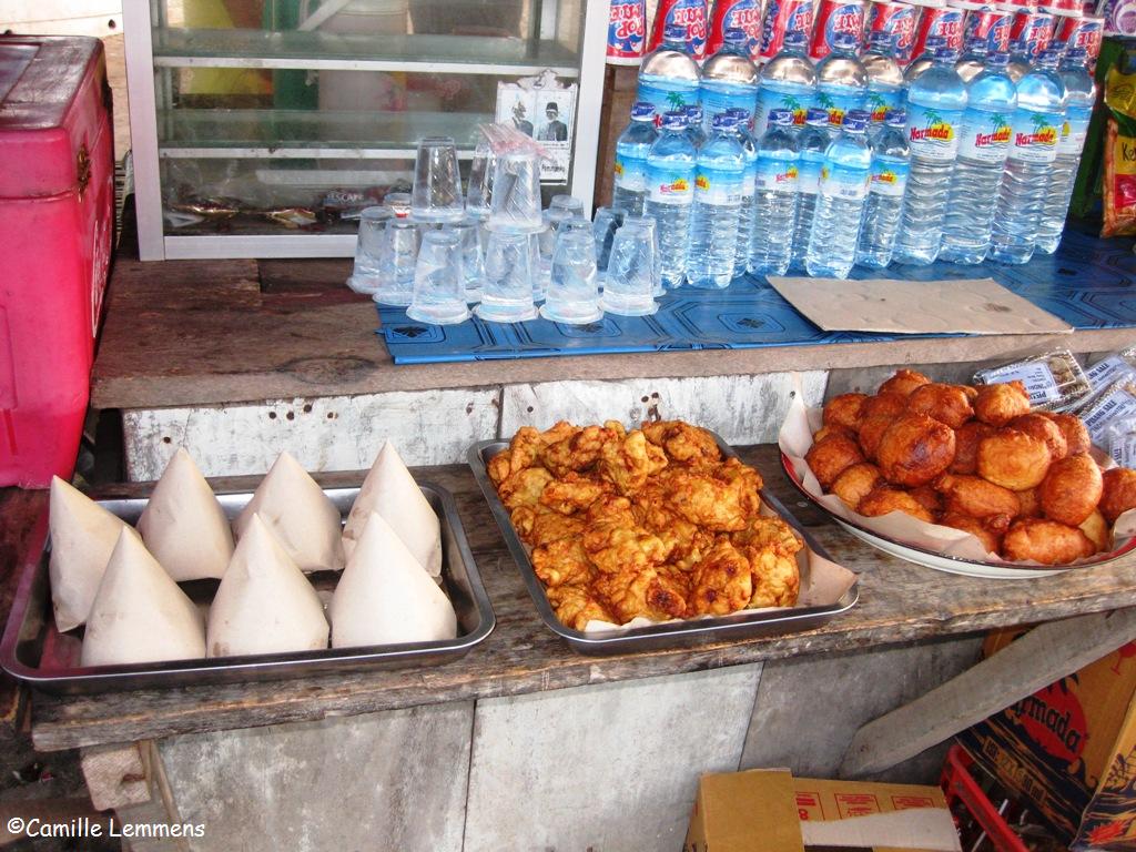 Breakfast on Gili, the papercups on the left are filled with rice and sauce, 'oliebollen' on the right and in the middle some sort of sweet tempura.